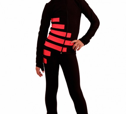 Set “IceCode” consists of thermo-jacket and thermo-pants with the original design course. For strict and laconic model this decision is the main focus. An asymmetrical arrangement of horizontal stripes placed on the jacket and pants attract attention in any visual projection. These finishes allocate the figure of the young athletes on the ice the best way. The perfect fit gives freedom of movement. A stitched in sleeve accentuates the sporty mood, making the jacket very comfortable. The bottom of the pants are decorated in an unusual manner and has a clasp that secures the pants under the heel of the shoe.