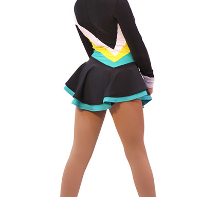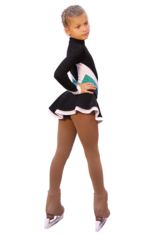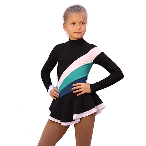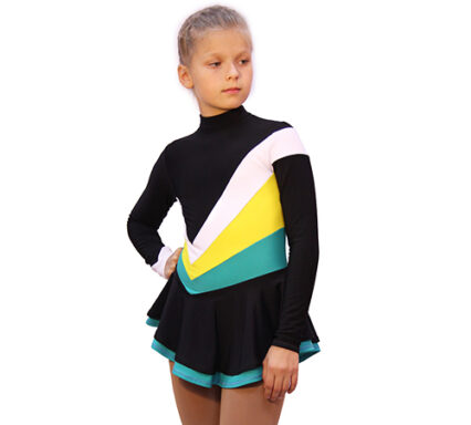 Absolutely everything in this model is attracting attention: the contrasting color combination of bright sporty design and the original design decision. Asymmetrical lines of a complex configuration, unusual sewing double layered skirt, finishing of the sleeves – all this attracts the eye. In this dress your child will be guaranteed to stand out on the ice and feel like a leader. And it’s so important.